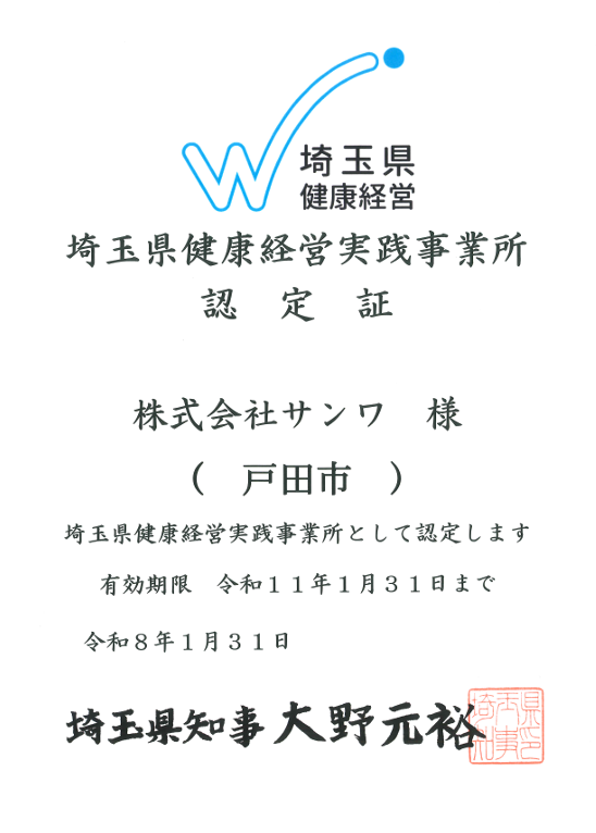 このたび、埼玉県が運営する「埼玉県健康経営認定制度」において、サンワは「埼玉県健康経営実践事業所」として認定されました。